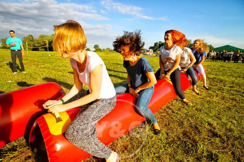 jump, jump, jump: come together now!This is a classic bounce game, suitable for children's parties, as well as organized parties and various team-building activities for your community or village. The players  sit on the tube and have to try and bounce their way to the other side of the trackIt is worth noting that walking is strictly forbidden. As its name suggests, runners must jump across the finish line. A bouncing tube is a great way to exercise and perfect your coordination skills, and its main benefit is the fun it provides!